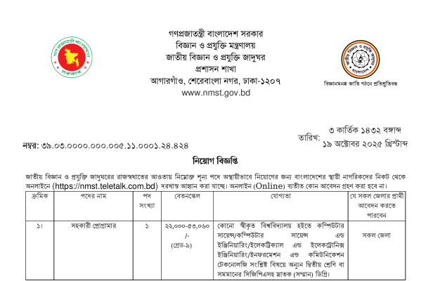 জাতীয় বিজ্ঞান ও প্রযুক্তি জাদুঘর নিয়োগ বিজ্ঞপ্তি ২০২৫ (NMST Job Circular): সহকারী প্রোগ্রামার পদে চাকরির সুযোগ