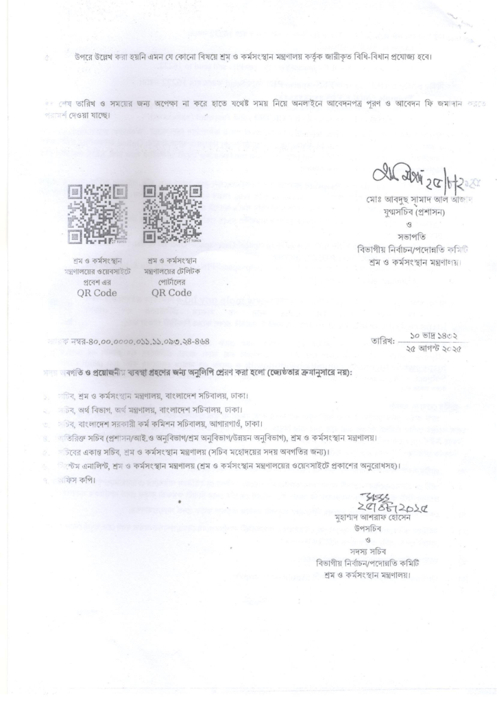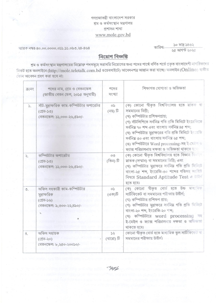শ্রম ও কর্মসংস্থান মন্ত্রণালয় (MOLE) নিয়োগ বিজ্ঞপ্তি ২০২৫