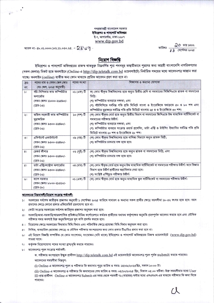 ইমিগ্রেশন ও পাসপোর্ট অধিদপ্তর নিয়োগ বিজ্ঞপ্তি ২০২৫ | DIP Job Circular 2025