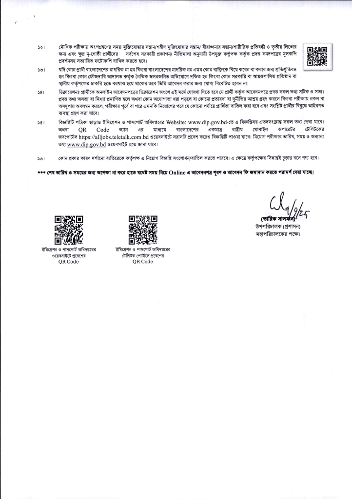 বিশেষ সতর্কতা: শেষ তারিখ ও সময়ের জন্য অপেক্ষা না করে হাতে যথেষ্ট সময় নিয়ে আবেদন প্রক্রিয়া সম্পন্ন করার জন্য অনুরোধ করা হলো। এই নিয়োগ বিজ্ঞপ্তি সংক্রান্ত যেকোনো পরিবর্তন বা হালনাগাদ তথ্যের জন্য নিয়মিত ইমিগ্রেশন ও পাসপোর্ট অধিদপ্তরের ওয়েবসাইট ভিজিট করুন।