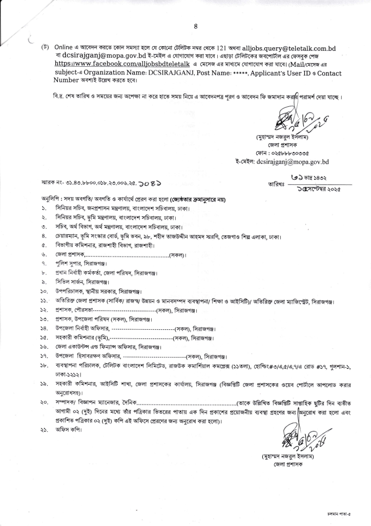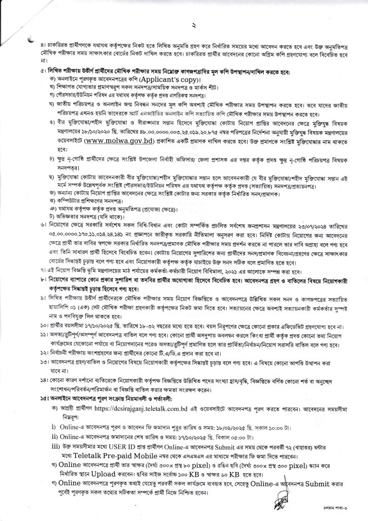 • আবেদন মাধ্যম: শুধুমাত্র অনলাইনে https://dcsirajganj.teletalk.com.bd ওয়েবসাইটের মাধ্যমে আবেদন করা যাবে।